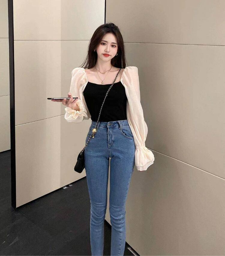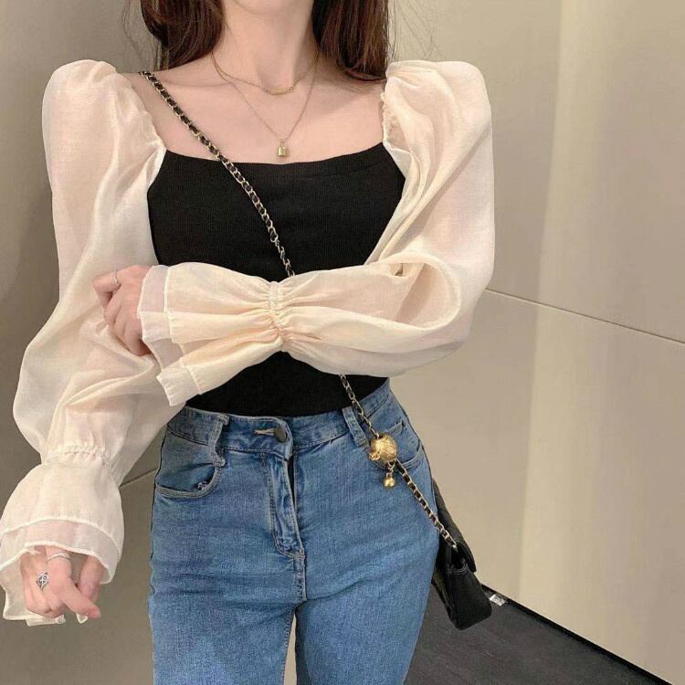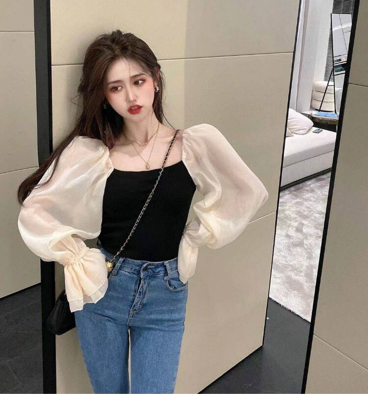 シフォンブラウス ストリートスタイル 露出鎖骨 ワンショルダー パフスリーブ トップス