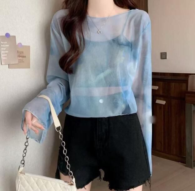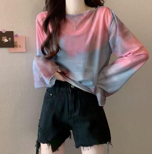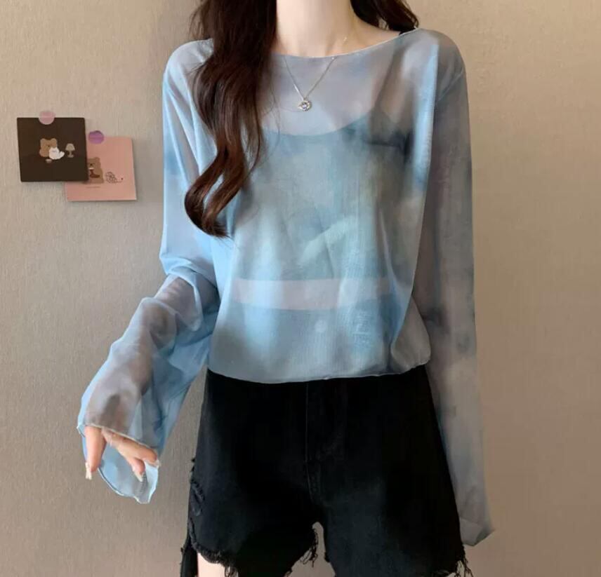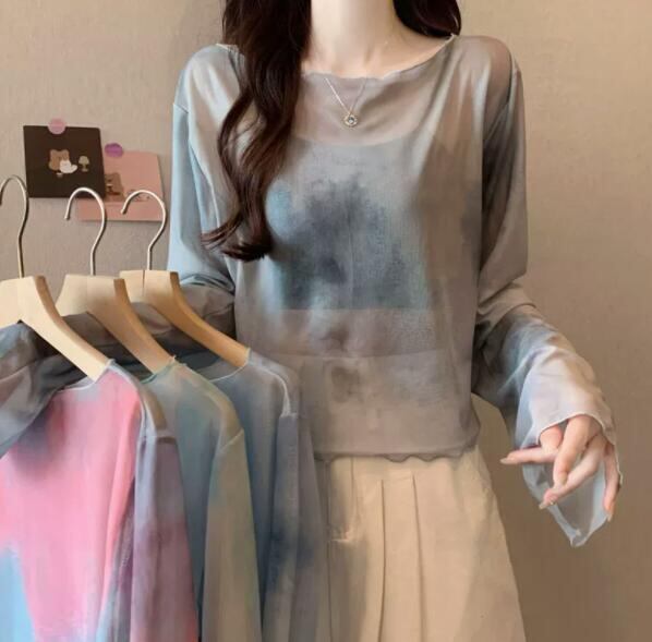 トップス レディース Tシャツ 長袖 ブラウス シースルー メッシュ 絞り染