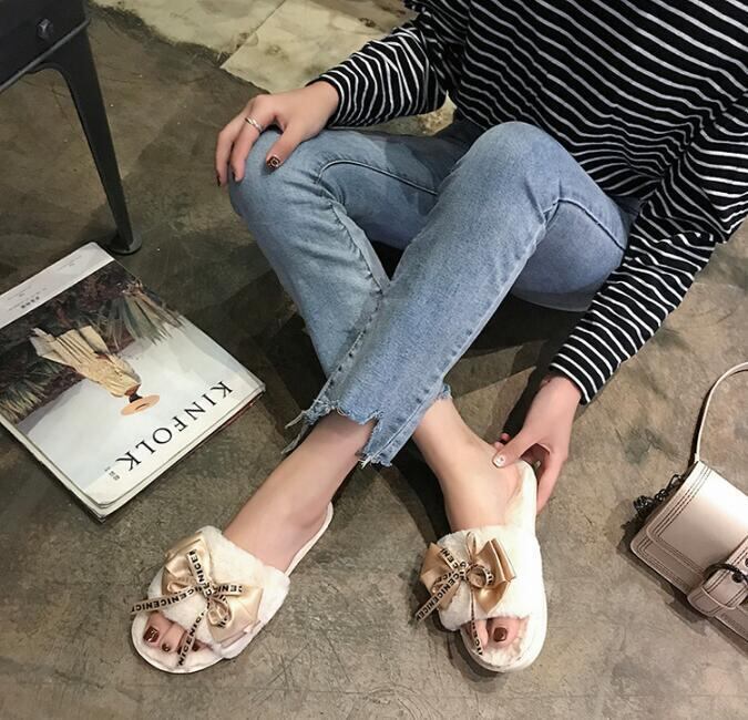 秋冬新作 シューズ スリッパ ファー 保暖 上品 リボン 出掛け もこもこ 滑り止め