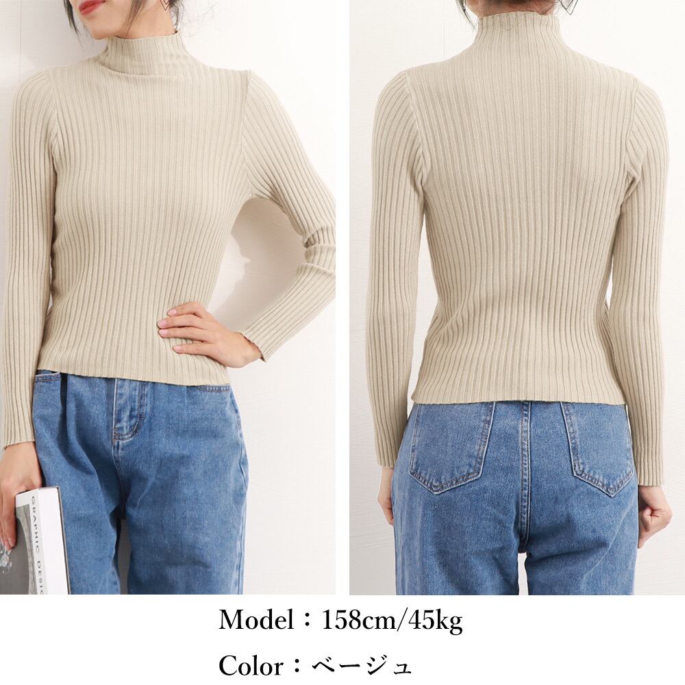 縦のラインを強調するリブ編みが程よいフィット感で、スタイルアップ見えしてくれるニットトップス