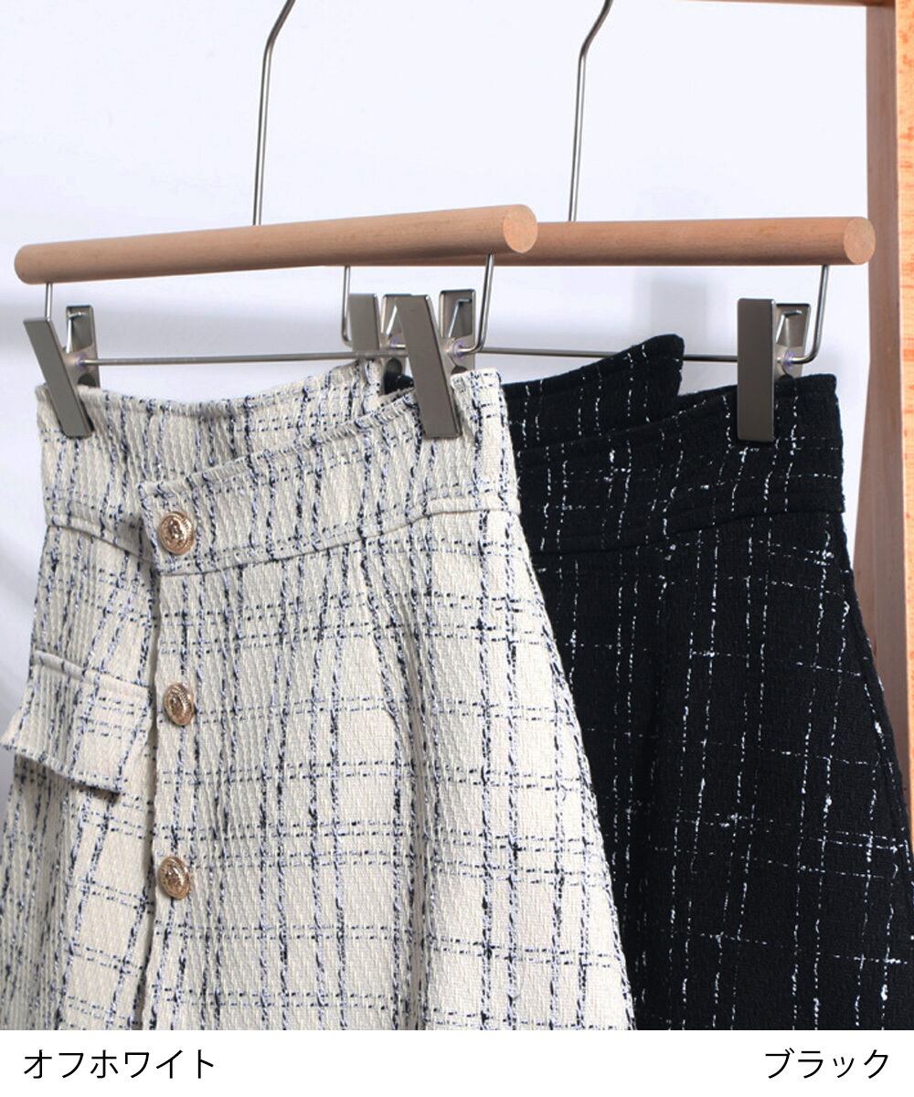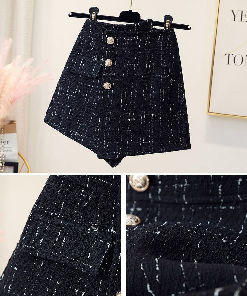 ツイード調のチェック柄が上品な印象を与えるハイウエストのラップ風ミニスカパン。